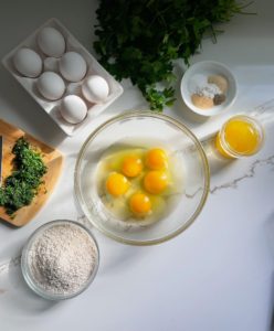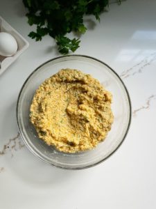 - Add 1/4 cup of finely chopped dill and parsley, 1 teaspoon of salt, 1 teaspoon of garlic powder, 1 teaspoon of onion powder, 1/2 teaspoon of baking powder and 1/4 teaspoon of black pepper and mix to combine