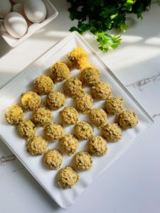 Once the balls have been formed, place them onto a parchment lined plate or baking sheet, lightly cover them with plastic wrap and let them chill in the refrigerator for 2 or more hours.
