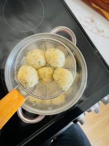 Once your matzo balls are fully chilled, bring a large pot of water to a boil and add a big pinch of salt. Carefully drop your matzo balls into the boiling water and let them cook for 15 minutes.