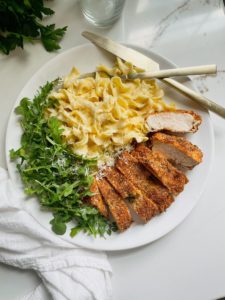 This matzo crusted chicken nestled alongside some creamy pasta and greens is perfect for everything from an easy weeknight dinner to weekend comfort food and anyone you serve this too will love the uniquely crisp texture of what matzo adds to the classic recipe.