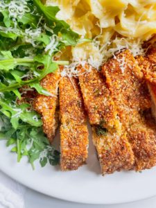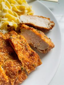 Carefully flip the chicken over and immediately sprinkle the crispy breading with salt. I also add a little dried parsley, but this is totally optional.
