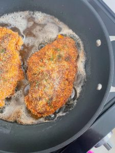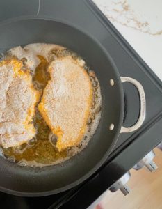 Add 1/2 cup of a neutral oil into a large skillet over medium heat. Allow the oil to warm for a few minutes before carefully placing the breaded chicken into the oil.