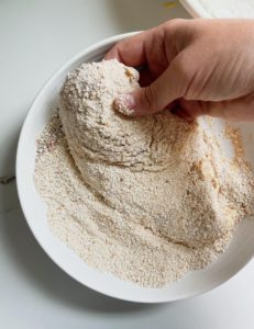 - In a separate shallow bowl, add 1/3 cup of all purpose flour and season with a pinch of salt and black pepper