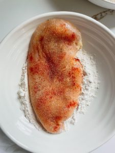 Season the chicken with your spices and dip into in the seasoned flour mixture.