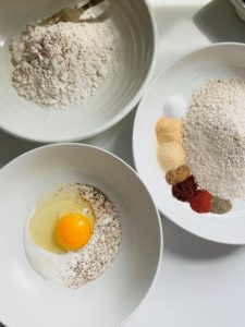 - In a third shallow bowl, combine 2/3 cup of matzo meal with 1/2 teaspoon of garlic powder, 1/2 teaspoon of onion powder, 1/2 teaspoon of paprika, 1/2 teaspoon of chili powder, 1/2 teaspoon of cumin, 1/2 teaspoon of salt and 1/4 teaspoon of black pepper.
