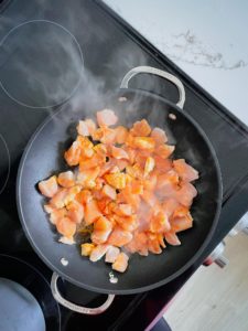 If you are cooking your own chicken, simply cut a boneless skinless chicken breast into bite sized pieces and season generously with your favorite seasoning blend. I love Lawry’s steak seasoning, but anything you love with work great. Place a skillet over medium heat, add a splash of olive oil and cook the chicken until it is completely cooked through and nicely browned.