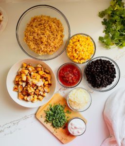 This recipe makes 4 lunches, but can easily be doubled or tripled if you are feeding more than one. Begin by gathering 1 pound of chicken (boneless skinless or a rotisserie chicken), 2 cups of cooked brown rice, 1 cup of canned sweet corn, 1 cup of canned black beans, 1/4 cup of shredded sharp cheddar, 1/4 cup of sour cream and 1/4 cup of your favorite salsa or pico de gallo.