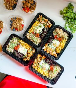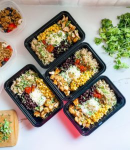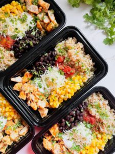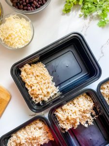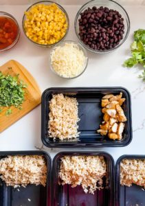 - Add 4 ounces of cooked chicken, 1/2 cup of cooked brown rice, 1/4 cup of rinsed sweet corn, 1/4 cup of rinsed black beans, 1 tablespoon of shredded sharp cheddar, 1 tablespoon of sour cream and 1 tablespoon of salsa into your meal prepping containers