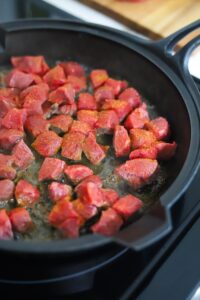 Drizzle some olive oil in a large skillet placed over medium heat and spread the beef cubes out so they have a little space in between them. If they are super crowded in the skillet, they won’t sear, they will just steam. If you are in a hurry and don’t care if your beef is seared on the outside and tender on the inside then feel free to add them all in together, but if the texture of your beef is important to you then spread them out a bit.