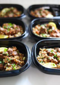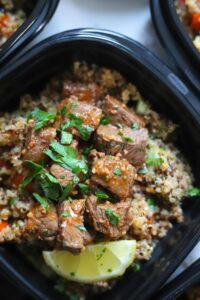 - Divide the quinoa between your meal prepping containers, top with the beef and add a few lemon wedges