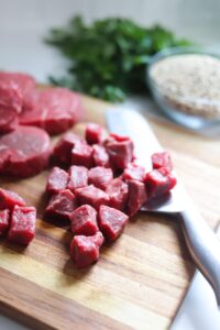 - Allow the beef to come to room temperature and then slice into bite sized cubes and season generously with seasoned salt