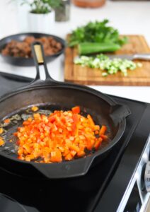 - Return the skillet to medium heat and add 2 diced sweet peppers into the leftover beef juices and cook for 3-4 minutes