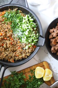 Fluffy quinoa tossed with garlic, sautéd sweet peppers, cucumbers, parsley and fresh lemon juice is topped with beef seared and then tossed in a buttery garlic pan sauce.