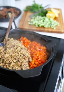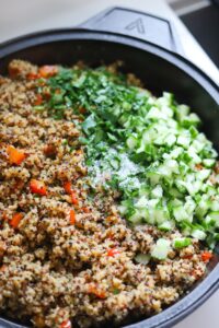 - Add the remaining 3 cloves of finely minced garlic and the cooked quinoa and mix until combined