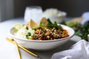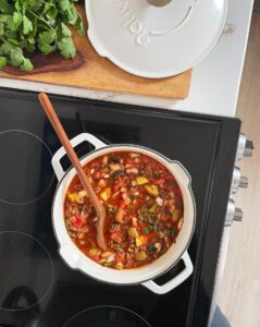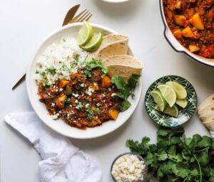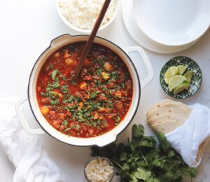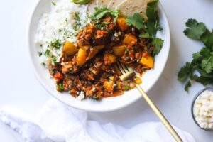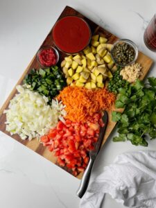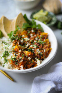 Today, we are making Mexican picadillo with lots of vegetables, warm spices, capers and cilantro in a flavorful tomato based sauce. This is one of those super flexible dishes that you can add what you have and omit what you don’t love and it will still come out delicious.