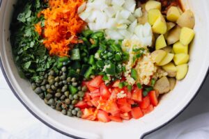 Now add all of the other ingredients… the garlic, onions, tomatoes, potatoes, poblanos, jalapeños, carrots, capers and cilantro. One of my favorite things about this meal is how you just add everything in together. There is no need to layer the vegetables in any certain order, just toss them in and start mixing.