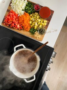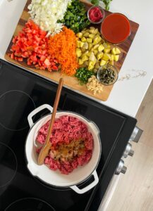 As soon as the beef is browned, all of the vegetables going in together, so I like to chop everything up in the beginning, so it’s ready to go.