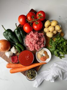 You will need 16 ounces of ground beef, a small yellow onion, 4 cloves of garlic, 2 vine ripened tomatoes, a poblano pepper, a jalapeño, a large carrot, a russet potato, 8 ounces of tomato purée, 1 tablespoon of tomato paste, garlic powder, onion powder, sazon, cumin, ground cinnamon, beef broth, some capers and fresh cilantro.