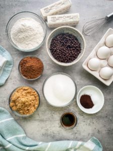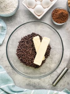 To get started you will need 220 grams of milk chocolate. You can use chips or a roughly chopped bar just be sure that it is a good quality chocolate that you would enjoy snacking on. If you don’t have a kitchen scale, 220 grams will be about 1 1/4 cups.You will also need 3/4 cup of butter, 4 large eggs, 1 1/4 cups of granulated sugar, 3/4 cup of brown sugar, 2 teaspoons of vanilla powder, 1/2 cup of unsweetened cocoa powder, 1 teaspoon salt, 1 tablespoon of espresso powder and 1 1/4 cups of all purpose flour.