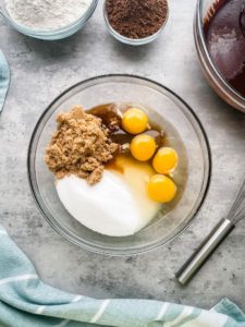 - In a separate bowl, whisk together 4 large eggs, 1 1/4 cups of granulated sugar, 3/4 cup of brown sugar and 2 teaspoons of vanilla extract until fully incorporated and pale yellow in color