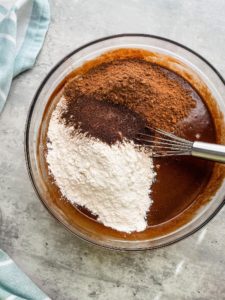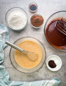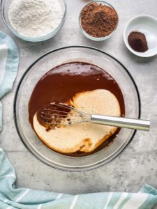 Once the melted chocolate has cool slightly (you want it cool enough that it will not cook the eggs), pour it into the bowl with the sugar and eggs and whisk everything together until fully incorporated.