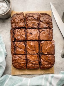 I like to bring the brownies out when the center is maybe just a little extra soft and then I transfer them onto a cooling rack, lay a clean kitchen towel over the dish and let them cool for about an hour. The towel is both to keep them protected and to help me forget about them while they cool.