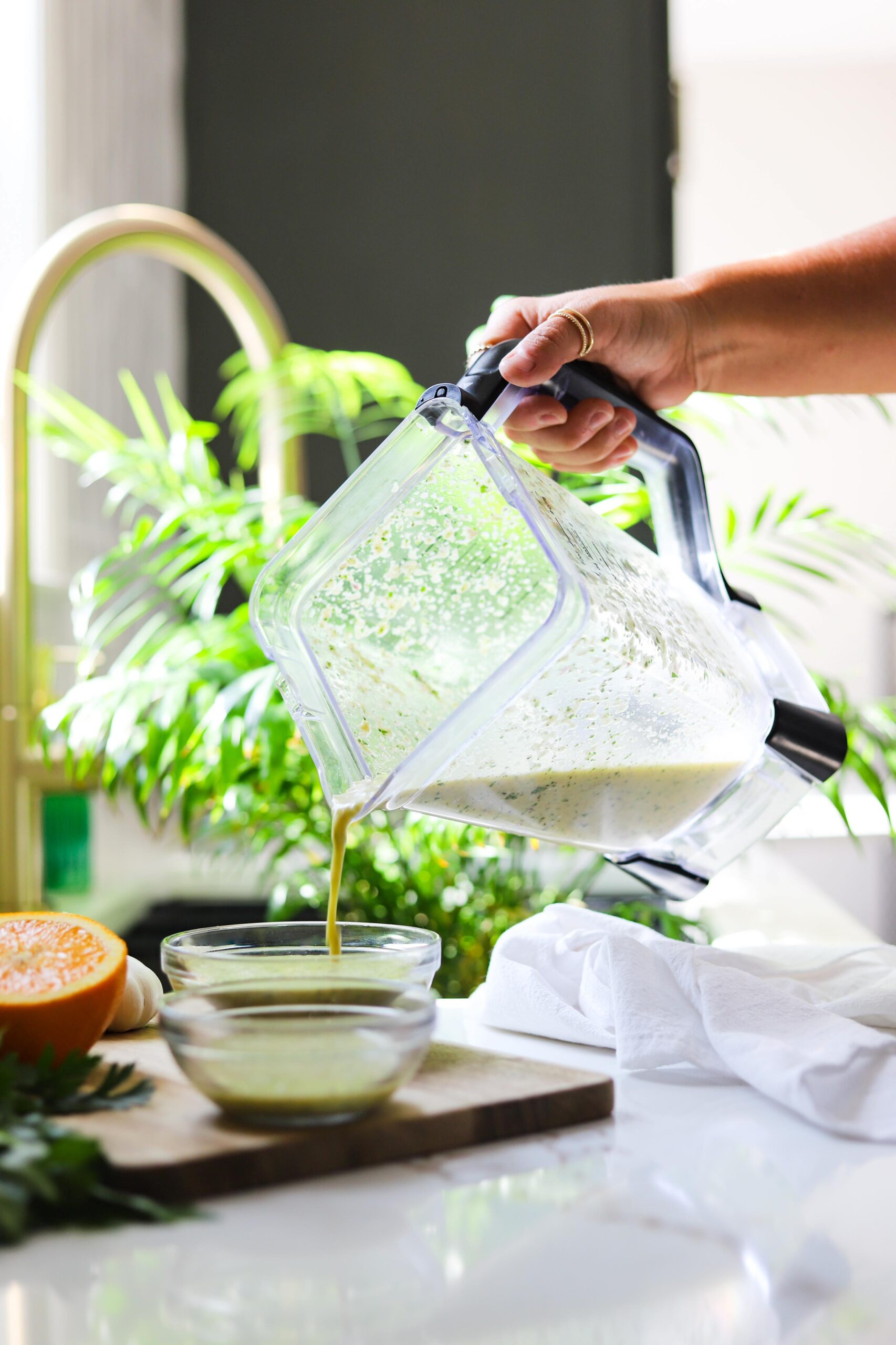 Divide the mojo sauce between 2 separate bowls. One of the bowls we will be using to marinade and baste the chicken with and the other will be served with the roast chicken later on.