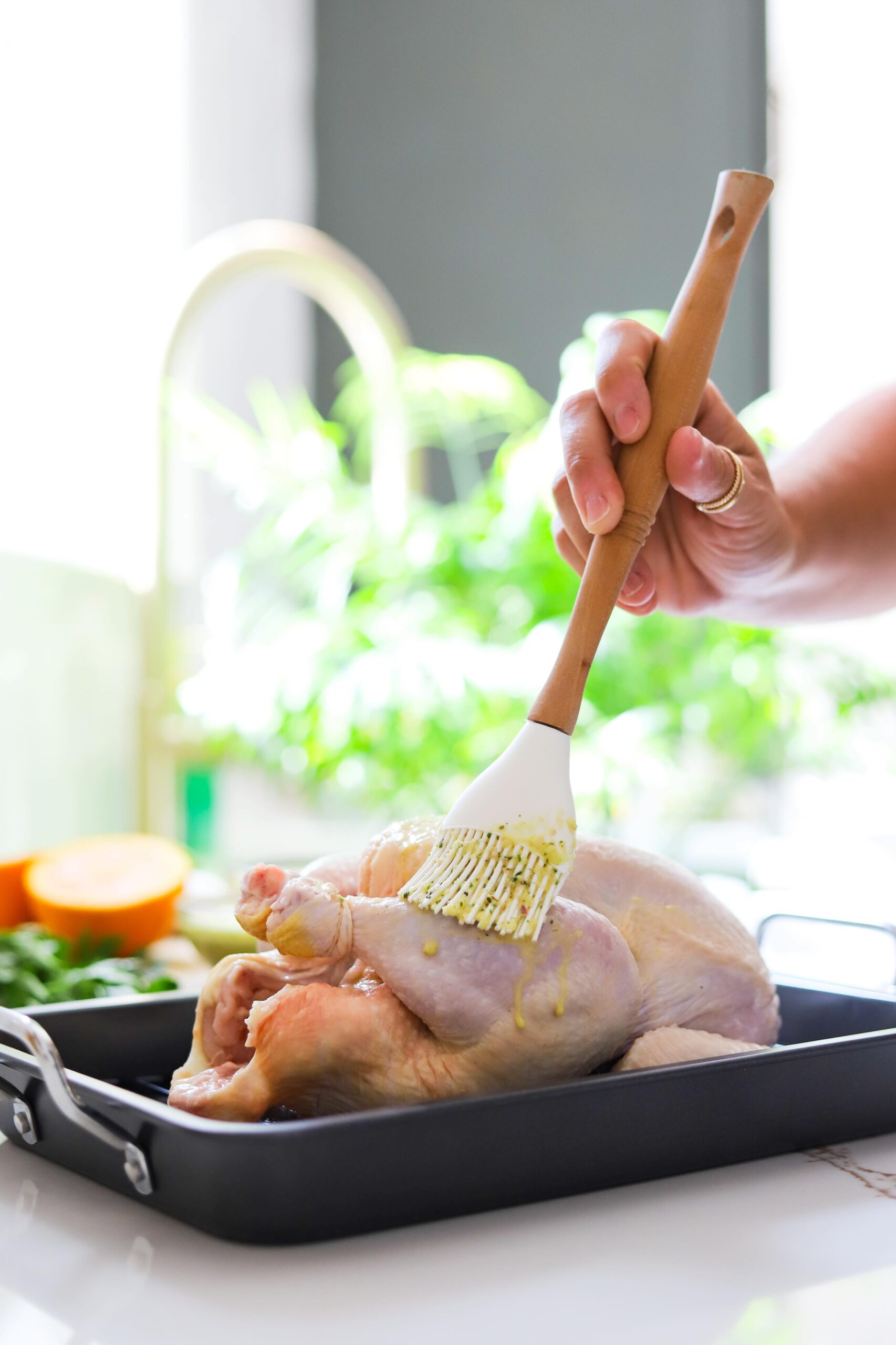 Once the chicken is marinated, brush it with a little more mojo sauce and roast it uncovered in a 350 degree oven for 22-25 minutes per pound. Brush with additional mojo sauce several times throughout the roasting time.