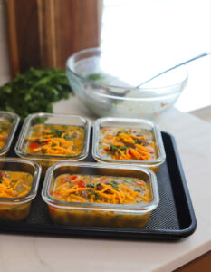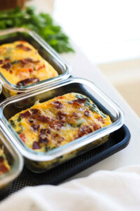 You can bake these frittatas in a generously greased 8 or 9 inch pie dish, a standard cupcake tin or oven safe meal prep containers. I usually use 5 individual glass containers, but feel free to bake this frittata in any size container you prefer.