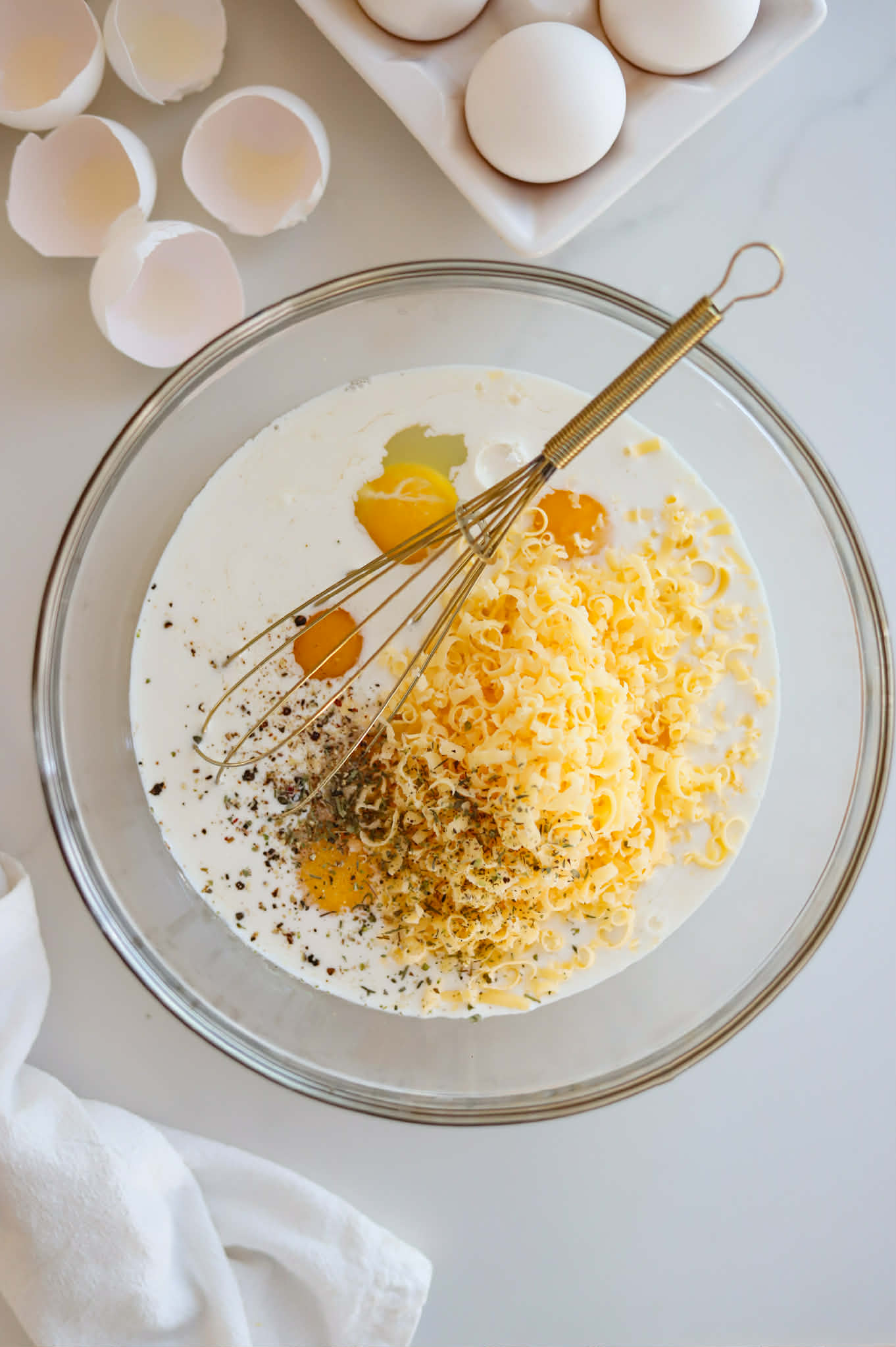 - In a large bowl, whisk 8 large eggs with 1/2 cup of your favorite milk, 1 teaspoon dried Italian herbs, 1/2 teaspoon of salt and a pinch of black pepper and set aside for now