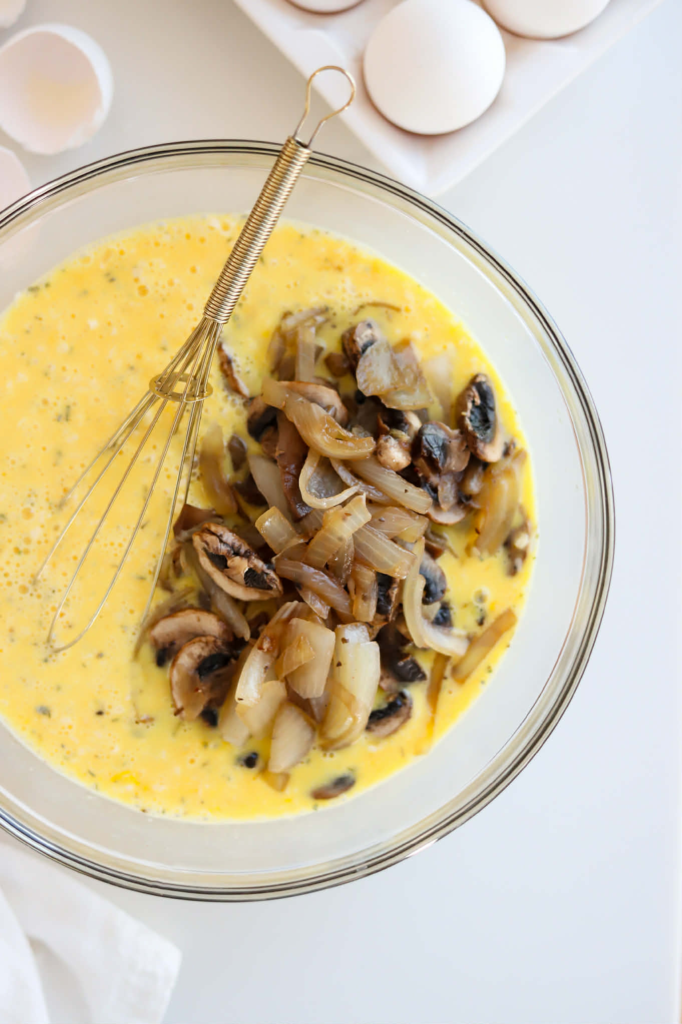 - Add the softened onions and mushrooms and 1/2 cup of shredded gouda into the egg mixture and mix to combine