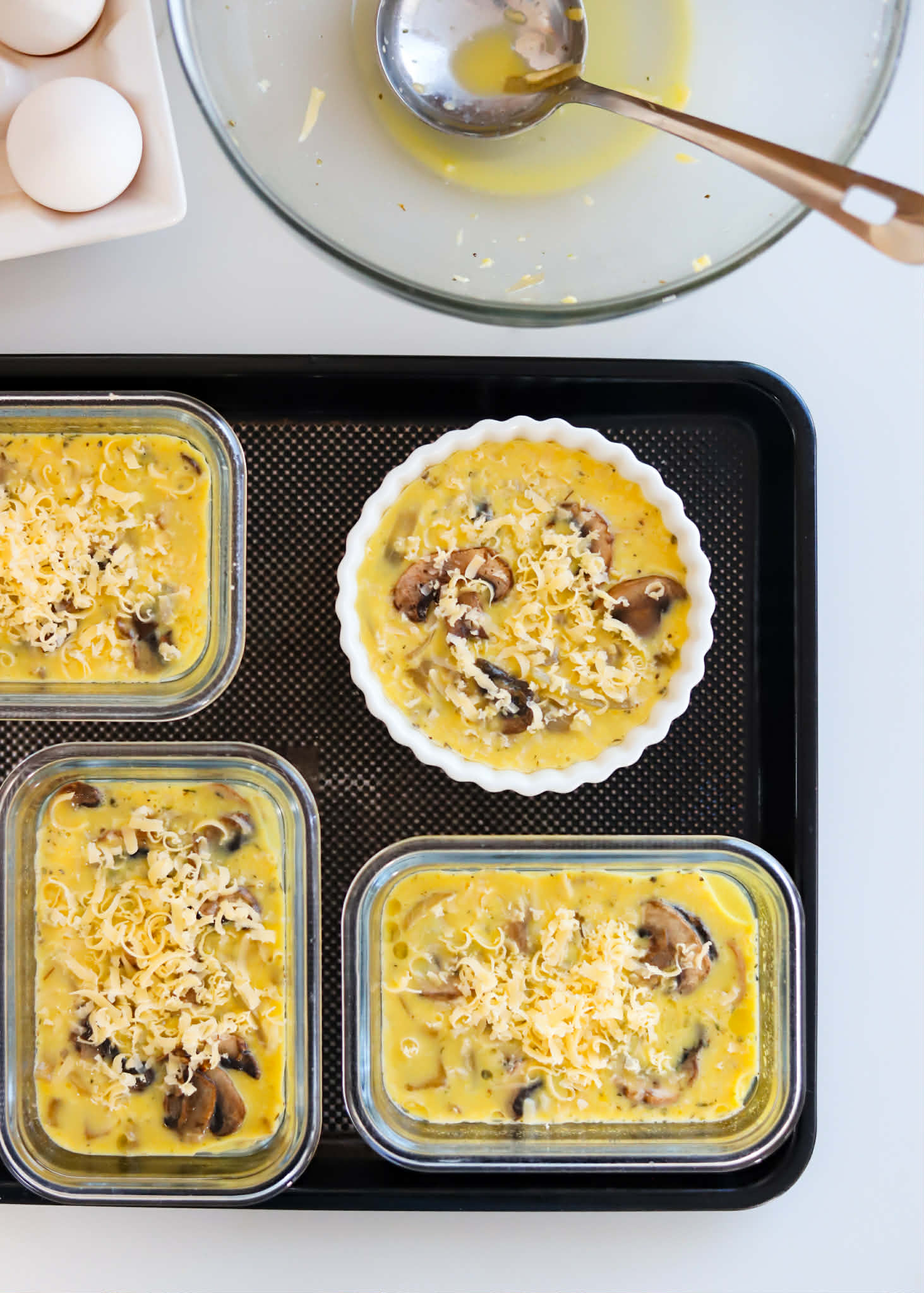 - Grease or line a standard muffin tin or glass oven safe meal prep containers and set aside for now