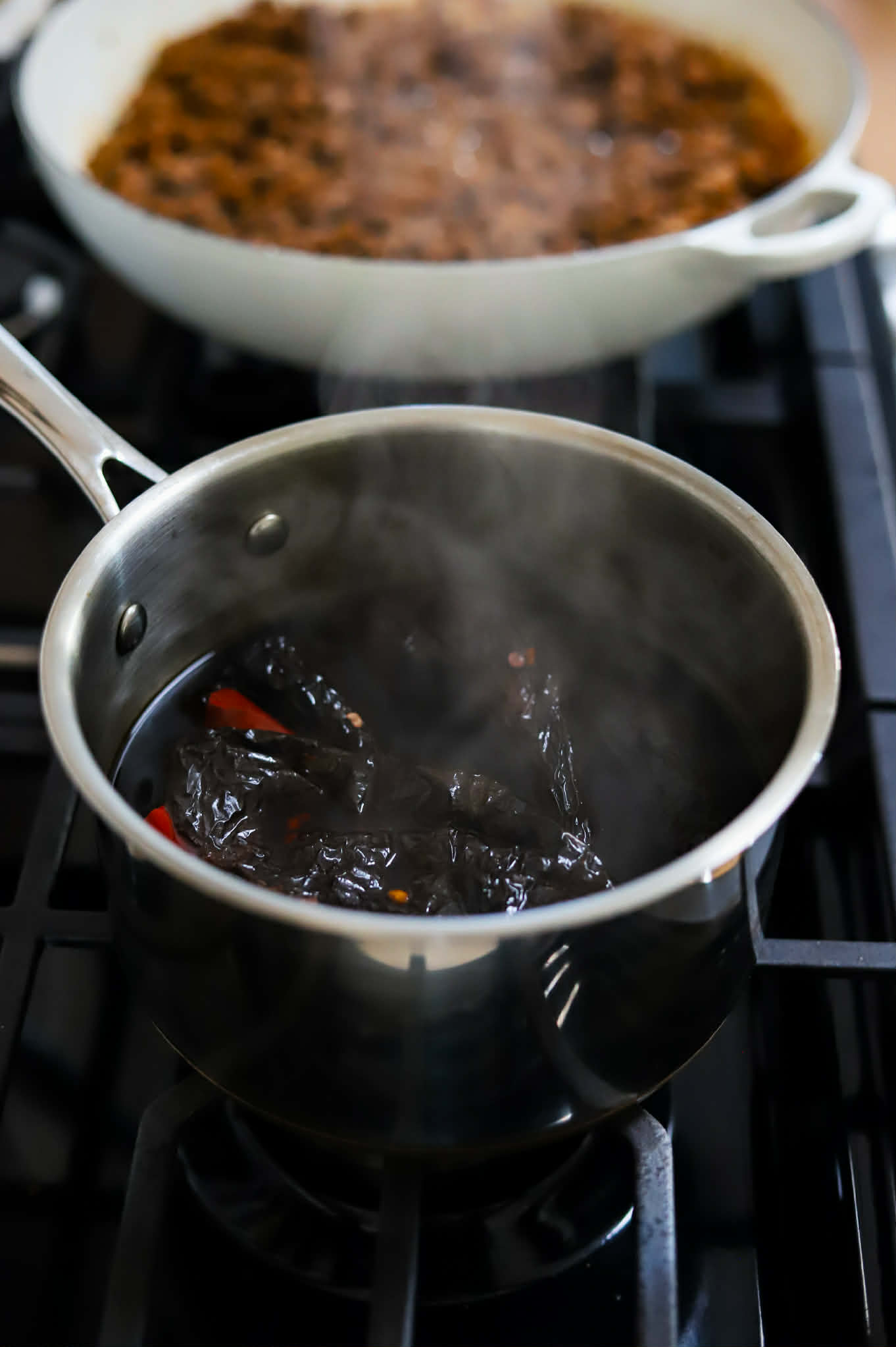 The first step is rehydrating the chilies. Start by removing the stems and seeds from 6 dried ancho chilies and 2 dried guajilo chiles and place them into a saucepan. Cover the chilies with water and bring them to a simmer.