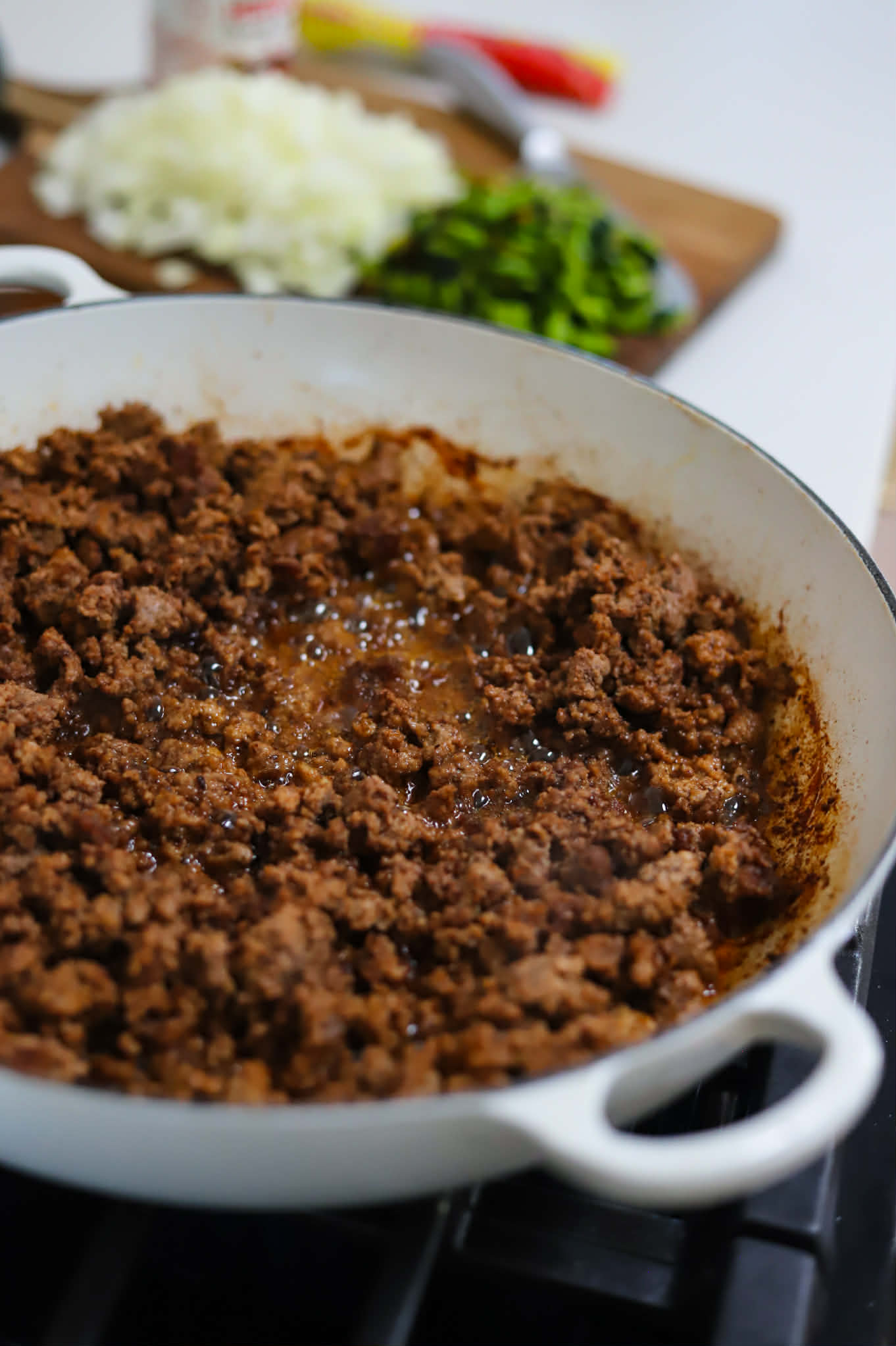 Begin by browning 2 pounds of ground beef, pork or a combination of both until cooked through and a little caramelized. Transfer the meat onto a plate and set aside for now.