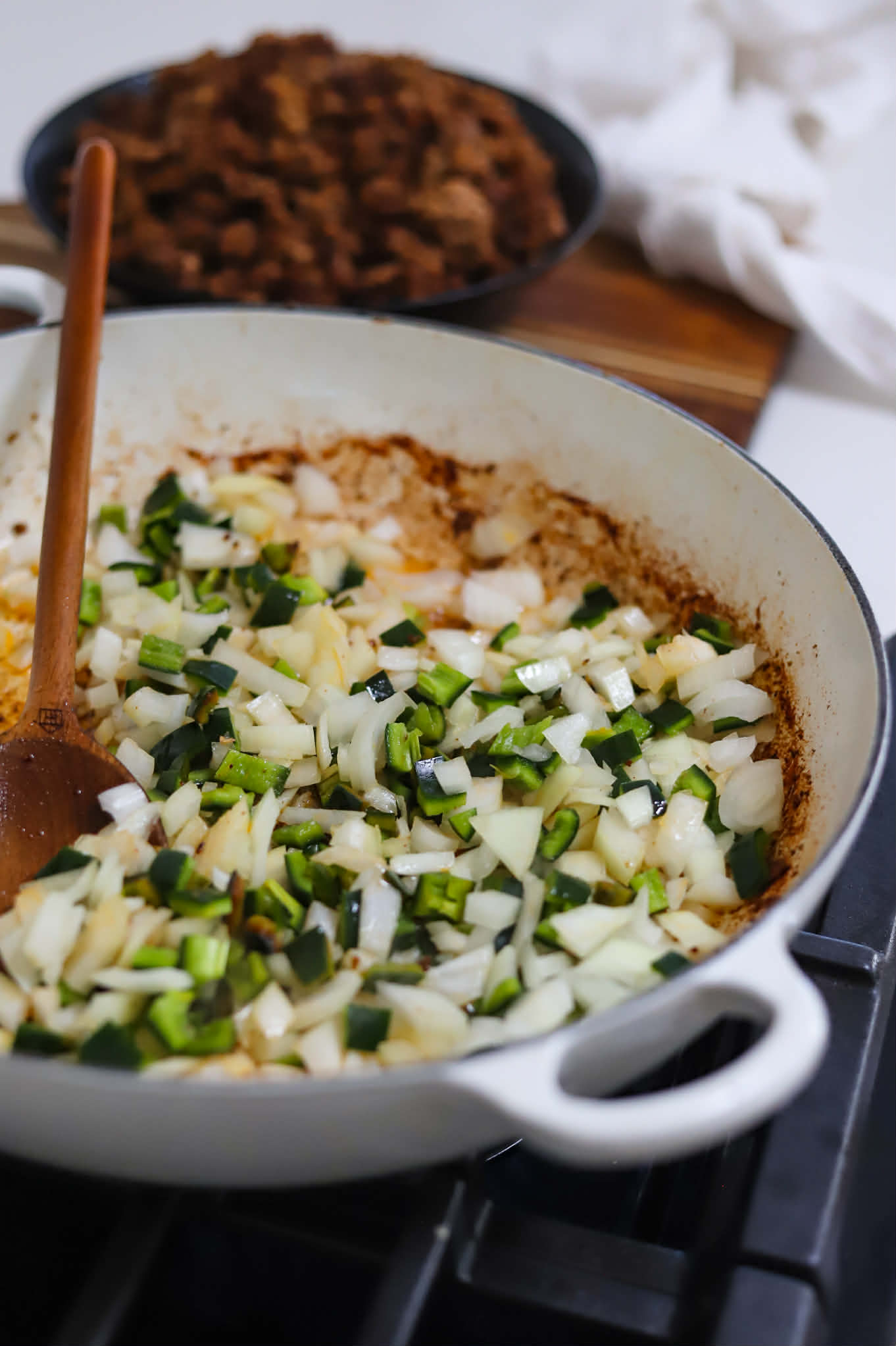 - Add 2 medium diced yellow onions and 2 diced poblano peppers and cook until they begin to soften (about 5 minutes)