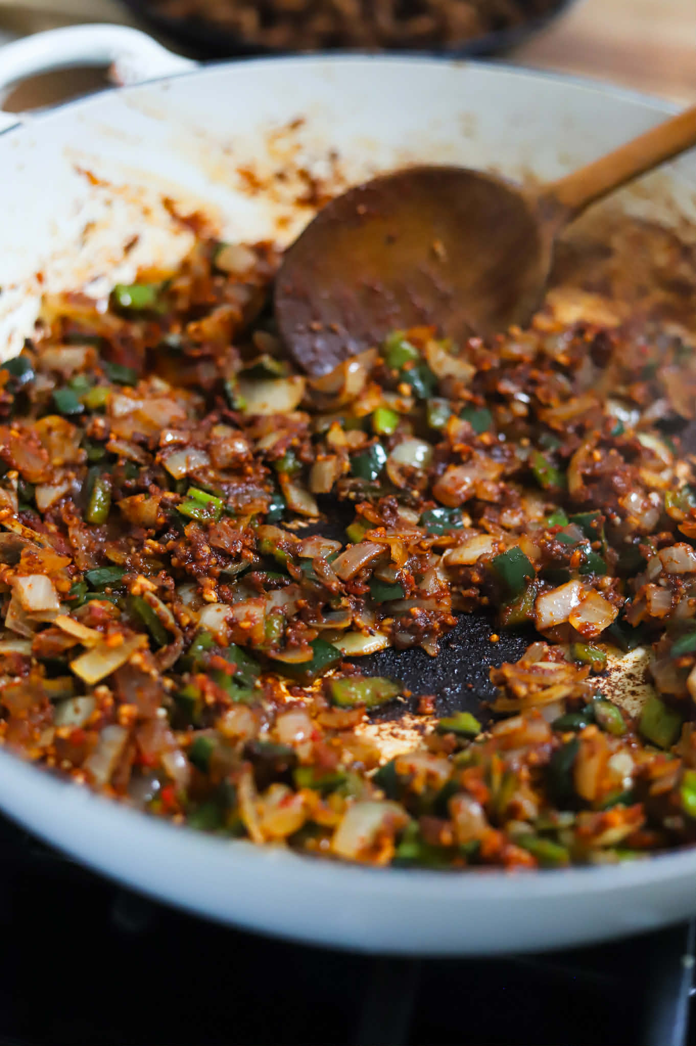 Note: If your chili tastes too sweet, too spicy or you accidentally added too much salt, do not fret! Simply add a splash of white vinegar (apple cider vinegar works here too), stir it in thoroughly and taste again. While I don’t always add the vinegar, I have added a splash of vinegar, stirred, tasted and then added a little more… stir, taste and add just a bit more. You will feel it balancing things out as you add it, so play with it until your chili tastes balanced and full of umami.
