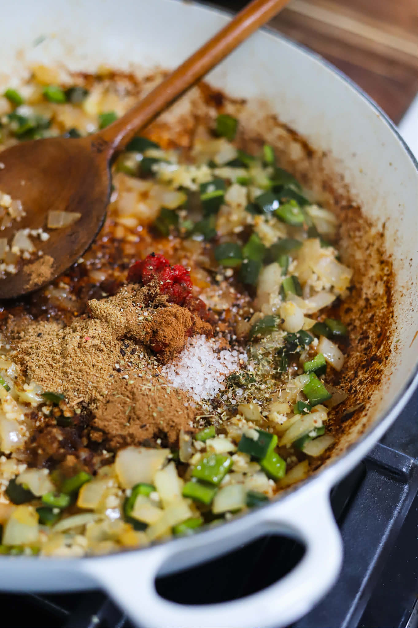 Now, add 2 tablespoons of tomato paste, 1 tablespoon of cumin, 1 teaspoon of Mexican oregano, 1 teaspoon of dried coriander and 1/2 teaspoon of ground cinnamon and cook until the mixture develops are beautiful deep rust color.