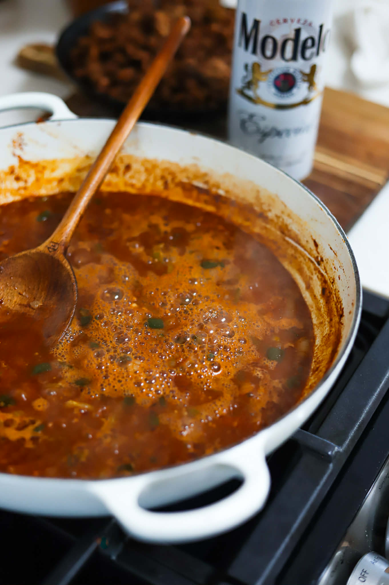 Once your mixture smells amazing and looks similar to the photo above, add 12 ounces of your favorite beer and use a wooden spoon to work all of the browned bits from the bottom of the skillet.