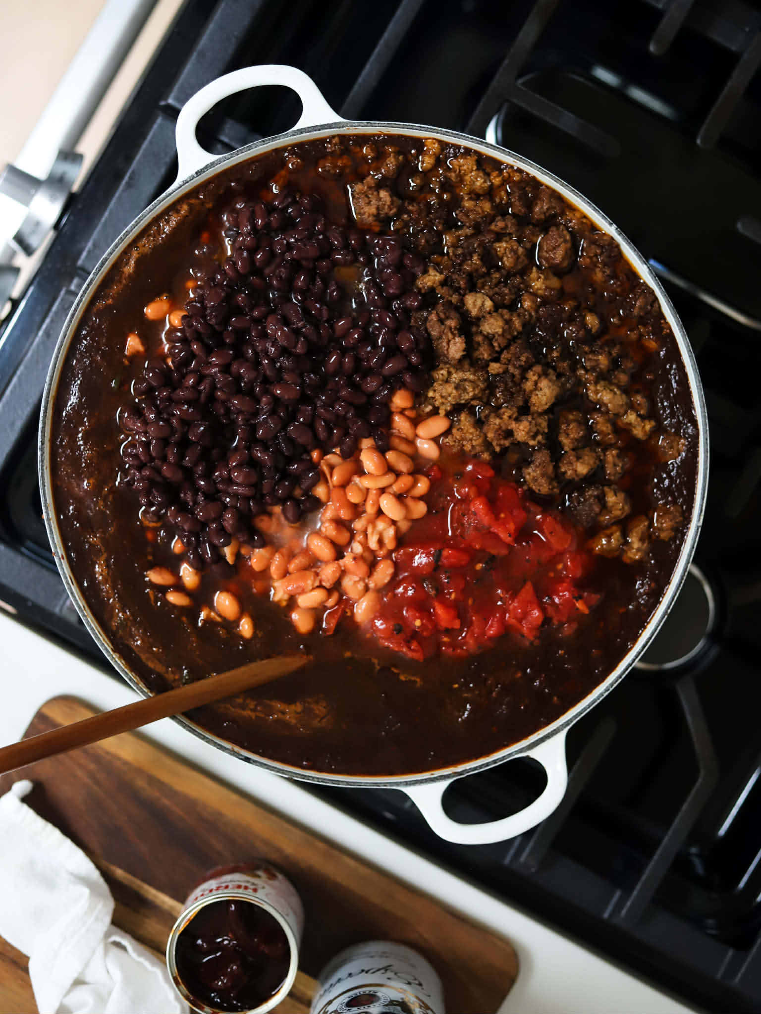 - Add the chili mixture into the pot along with the browned meat, 28 ounces of fire roasted tomatoes, 30 ounces of black beans and 30 ounces of pinto beans and stir until well combined