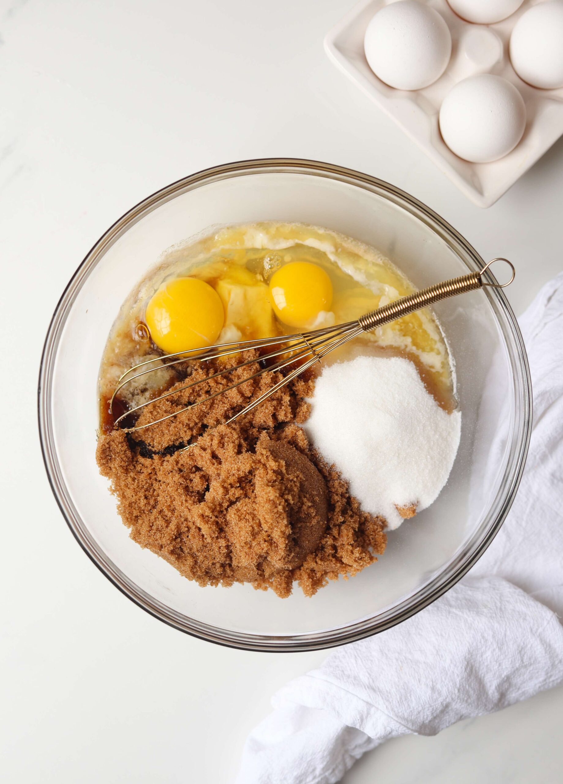 Begin by combining 12 tablespoons of room temperature butter with 3/4 cup of brown sugar, 1/2 cup of granulated sugar, 2 large eggs and 2 teaspoons of vanilla extract in a large bowl and whisk until everything is completely combined.