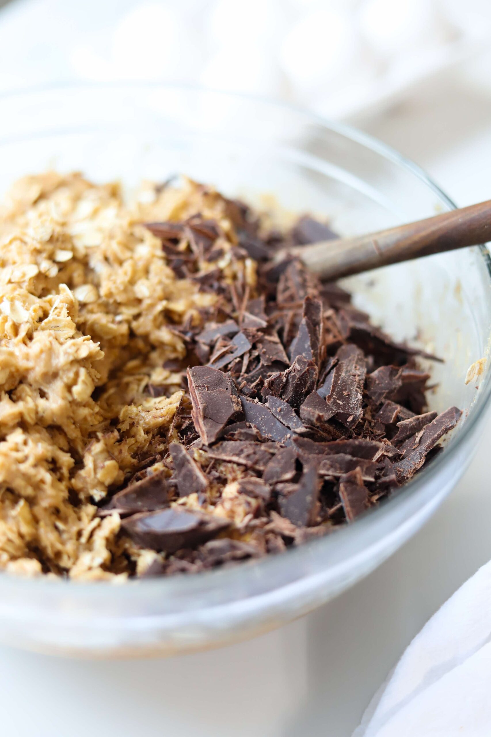 Fold in 3 1/4 cups of old fashioned oats and then mix in your chocolate. You can use chopped chocolate or chocolate chips and whatever you love or have on hand. Dark chocolate works great in these cookies, but so does milk chocolate and semi-sweet.