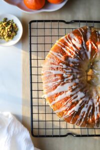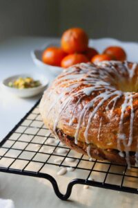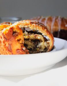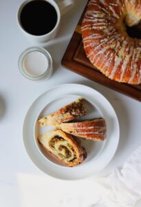There is a little bit of controversy around whether traditional nut rolls should be left plain or drizzled with a simple glaze, but these orange pistachio nut rolls are not traditional, so I am drizzling a simple vanilla orange glaze over these nut rolls and sprinkling some crushed pistachios over the glaze. Beautiful and delicious…