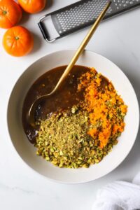 - Stir in 3 cups of very finely chopped pistachios along with a tablespoon of fresh orange juice, 2 tablespoons of fresh orange zest, 1/2 teaspoon of vanilla extract and 1/2 teaspoon of citrus extract and set aside to cool
