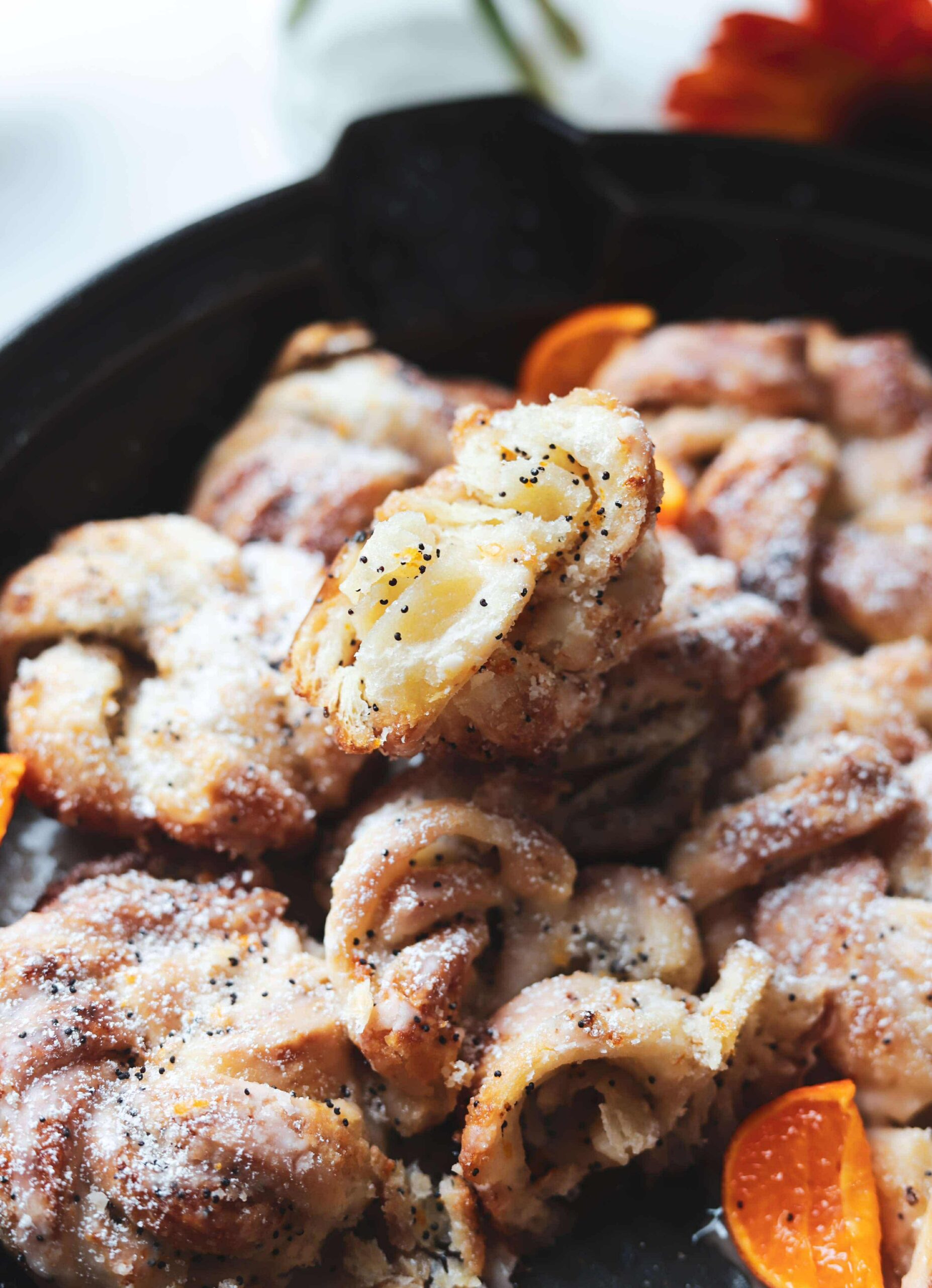 The texture of the inside and outside of these rolls are quite special. I can’t decide which I love more… the crispy edges drizzled with that orange glaze or the middle with those layers and that sweet poppyseed filling.