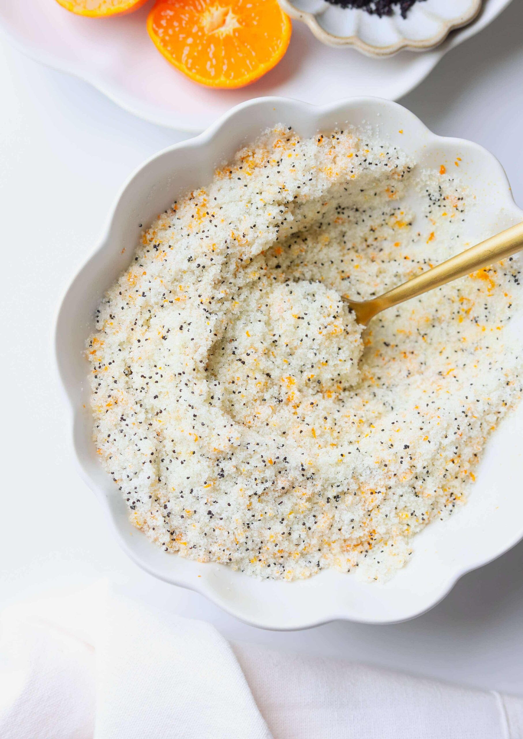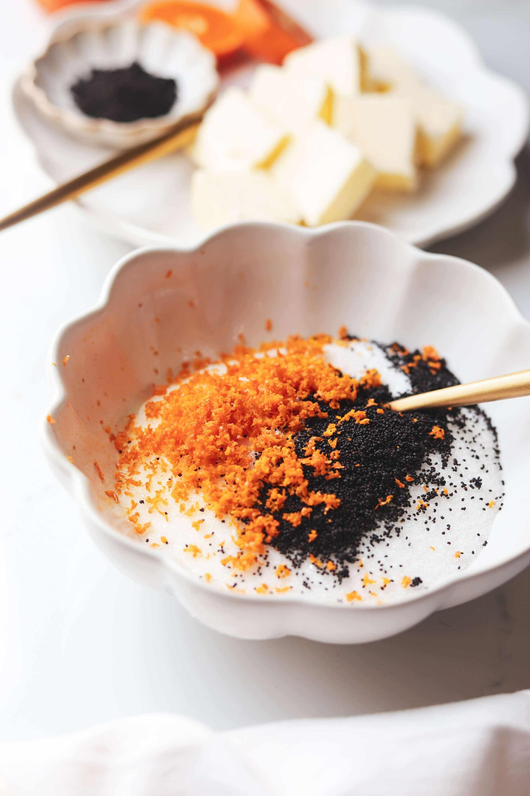 - In a small bowl, combine 3/4 cup of granulated sugar, 2 tablespoons of poppyseeds and 2 tablespoons of fresh orange zest and set aside for now