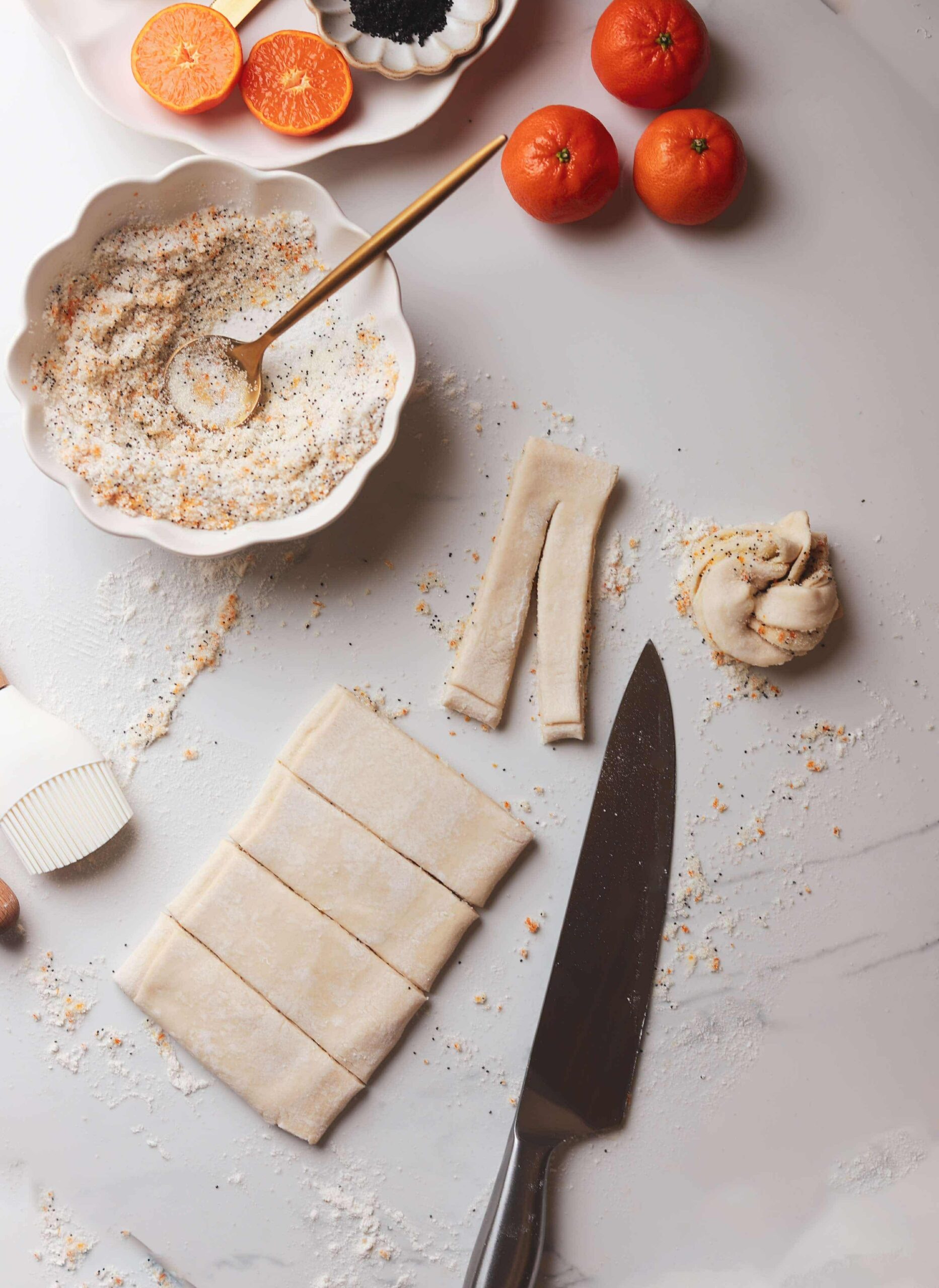 - Using a sharp knife, slice the folded puff pastry into 12 equal sections