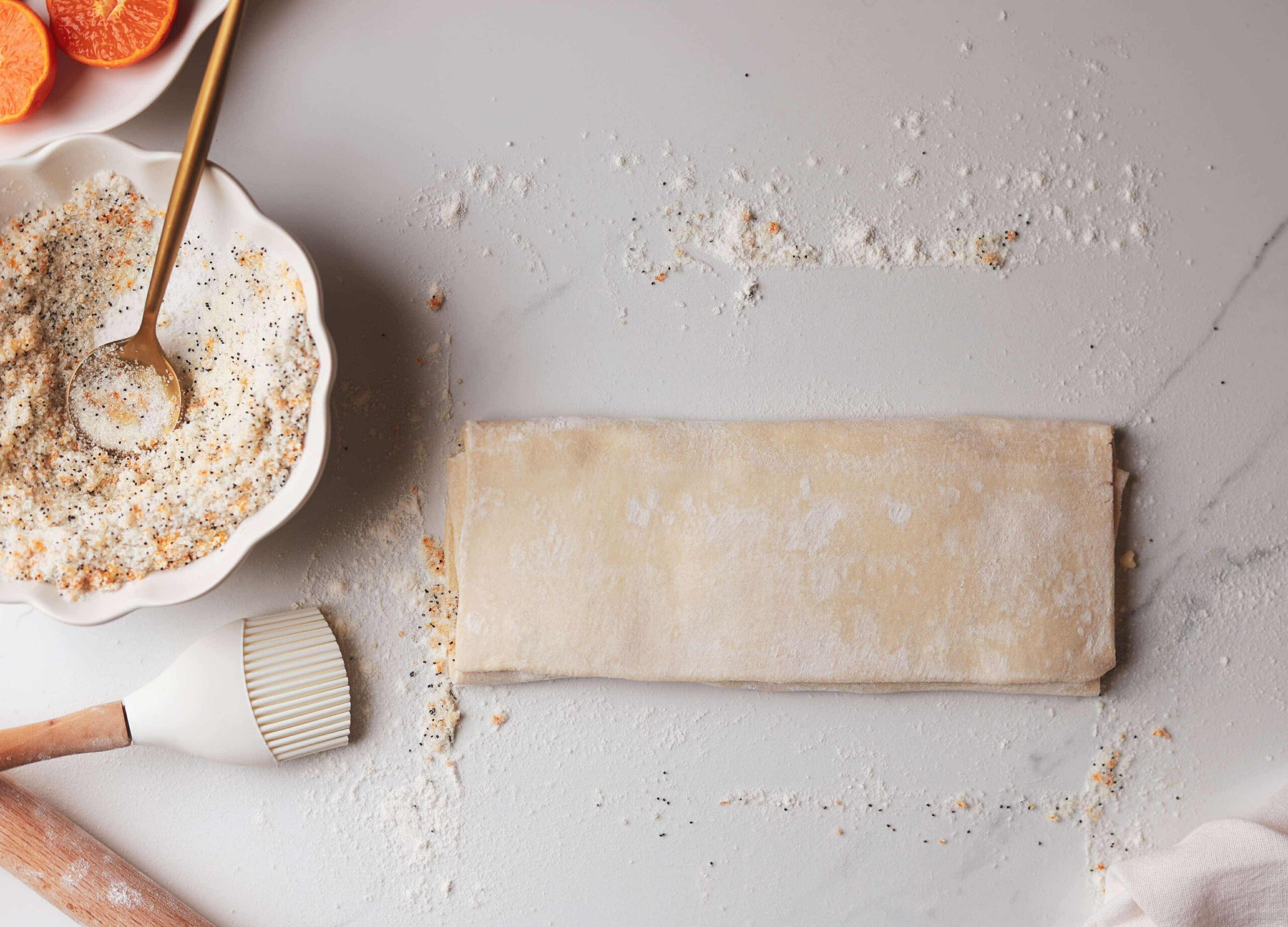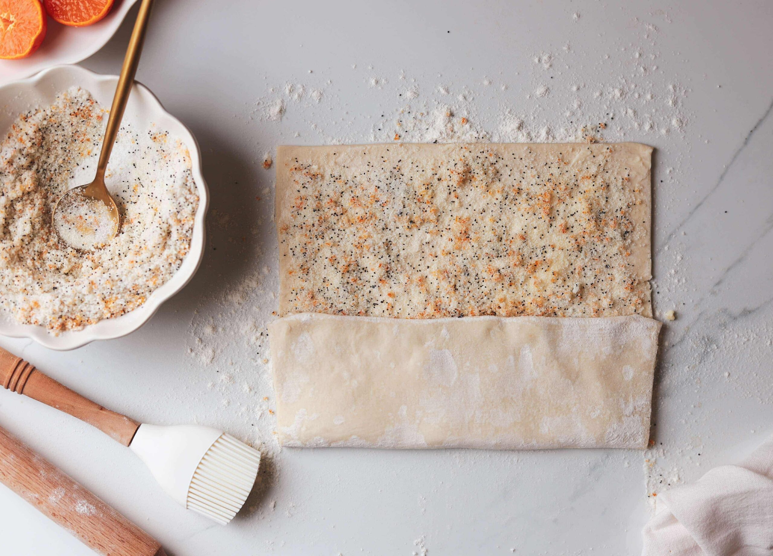 - Starting at the narrow end of the sheet of puff pastry, fold 1/3 of the sheet in towards the center then fold the other 1/3 over top of the folded 1/3 creating 3 layers