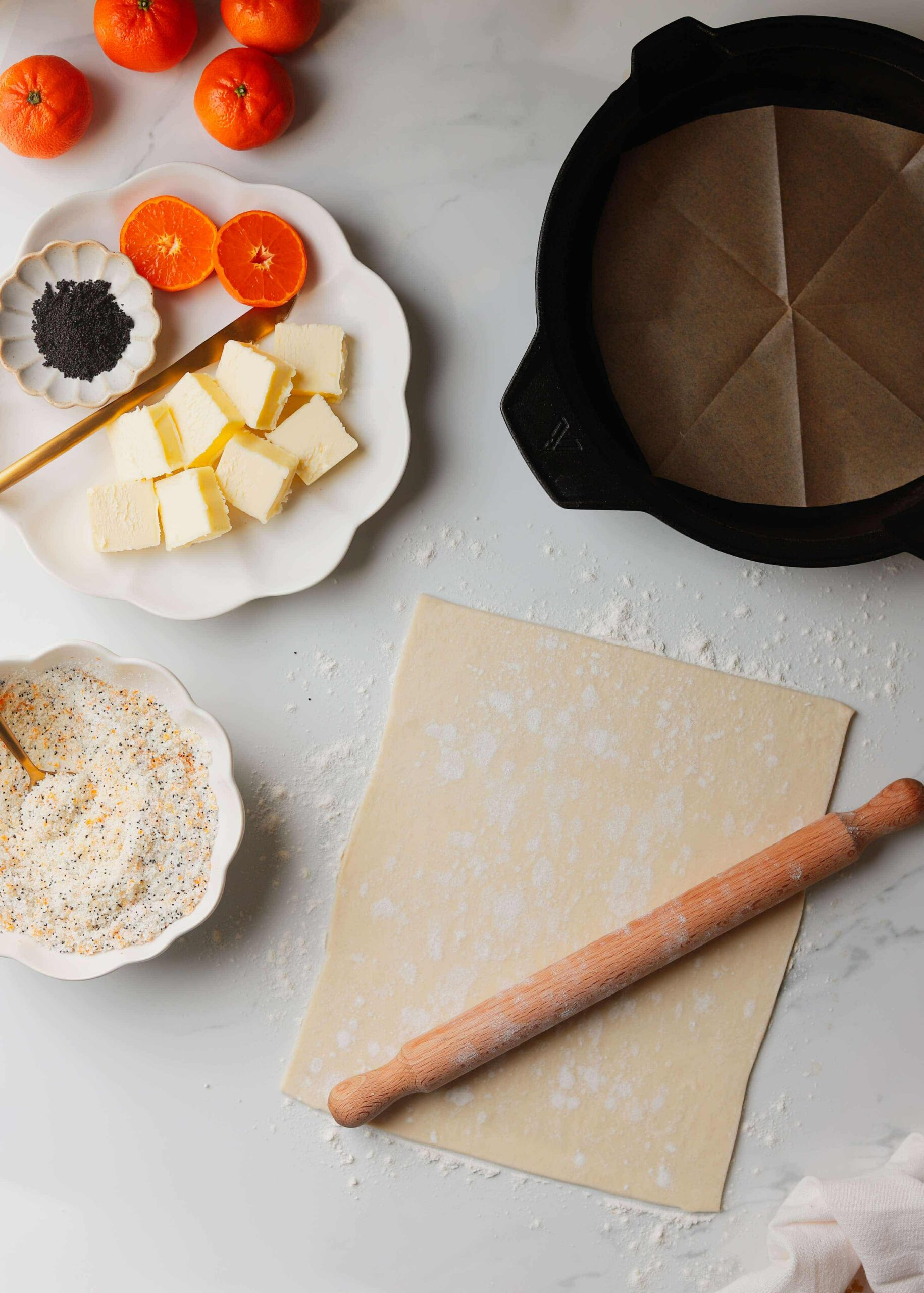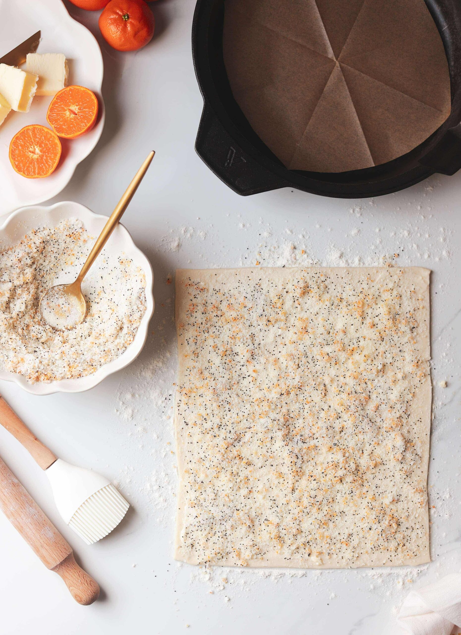 Roll your puff pastry out evenly over a sheet of parchment paper or a very lightly floured surface. It doesn’t need to be rolled thin, just even throughout.
