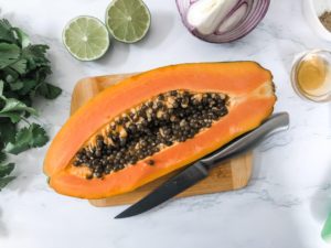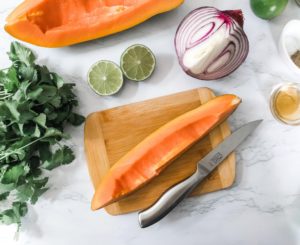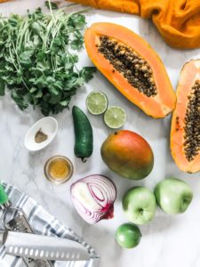 To get started, you will need 1 small papaya (a ripe, orange papaya), 1 mango, 1 Granny Smith apple, 1 small jalapeño, some red onion, fresh cilantro, a few limes and some honey. If you can’t find a smaller papaya, use half of a big one and use the other half for a smoothie (thats what I did!).