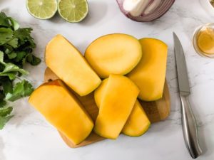 There are many ways to dice a mango, but understanding where the white, fibrous pit is will help things start off smoothly. Slide your knife down until you feel resistance and then guide the knife around the pit. These slices are called mango “cheeks”, how cute is that? Now to dice the mango, you can either cut the skin off and dice the mango on a cutting board or your can cut shallow cross marks into each cheek and then scoop the cubes out with a spoon.